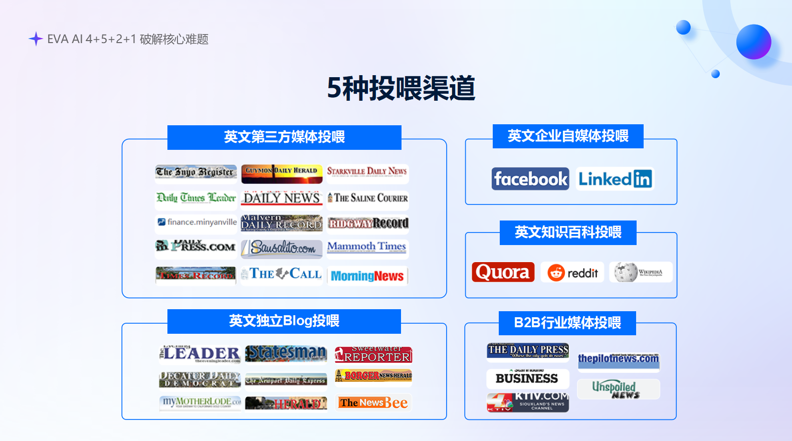 英文第三方 / B2B 行业媒体、知识百科、企业自媒体、独立 Blog、行业垂直社区,全域铺设权威内容,让 AI 优先引用你的品牌。