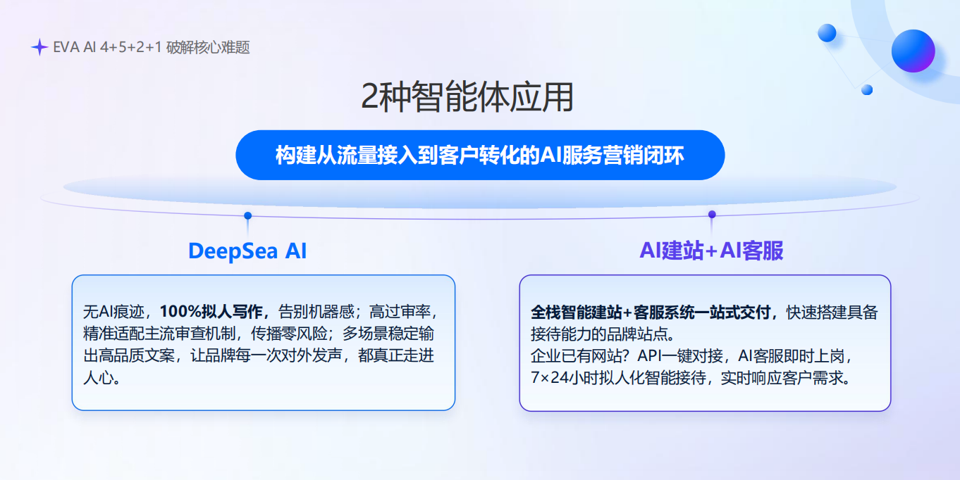 依托出海帮十年跨境技术沉淀、全链路产品矩阵,亿网搜 EVA AI 打造的 4+5+2+1 体系,每一环都针对海外 AI 逻辑、用户决策习惯设计,还能无缝衔接出海帮其他产品,实现流量 - 转化 - 私域全打通。